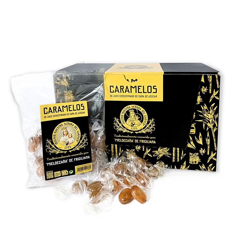 Box with 6 display boxes of 10 bags of 100 g candies (60 bags) of concentrated sugarcane juice traditionally known as «MIELDECAÑA» from Frigiliana.